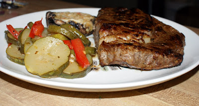 Sunday night, though, he cooked Rib-eyes from a local farmer with a side of sauteed zucchini and bell peppers. I managed to coax him out of that recipe to share with you.