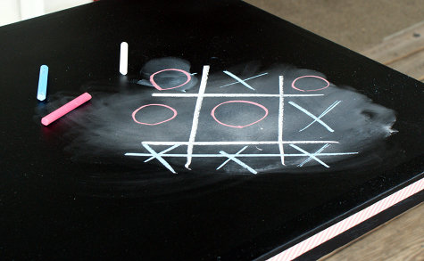 One final note. You will want to allow your chalkboard paint to dry for a full 24 hours before attempting to write on it. This allows it cure completely to avoid scratching the paint off with the chalk. After 24 hours you would then prep your chalkboard surface by rubbing the SIDE of a piece of chalk over the surface then erasing. Now your chalkboard table top is ready for games of tic-tac-toe, artwork, or whatever else the heart desires!